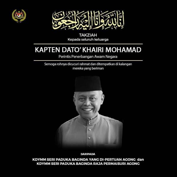 KUALA LUMPUR, Nov 14 — The Yang di-Pertuan Agong Al-Sultan Abdullah Ri'ayatuddin Al-Mustafa Billah Shah today extended his condolences to the wife and family of Captain Datuk Khairi Mohamad, one of the country's pioneer civil aviators, who died last Thursday.