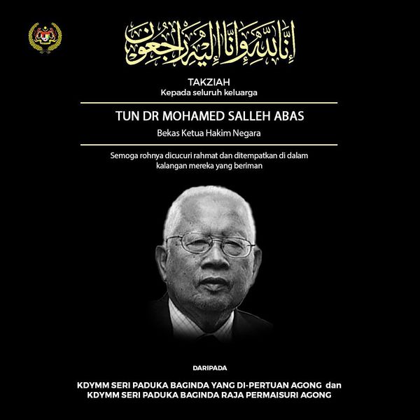 KUALA LUMPUR, Jan 16 — Yang di-Pertuan Agong Al-Sultan Abdullah Ri’ayatuddin Al-Mustafa Billah Shah and Raja Permaisuri Agong Tunku Hajah Azizah Aminah Maimunah Iskandariah have expressed their condolences to the family of former Lord President Tun Dr Mohamed Salleh Abas, who died today.