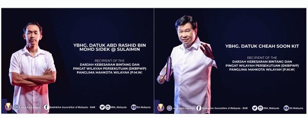 Another former national badminton player, Cheah Soon Kit, who won the silver medal in the 1996 Olympic Games, also received his Datukship.