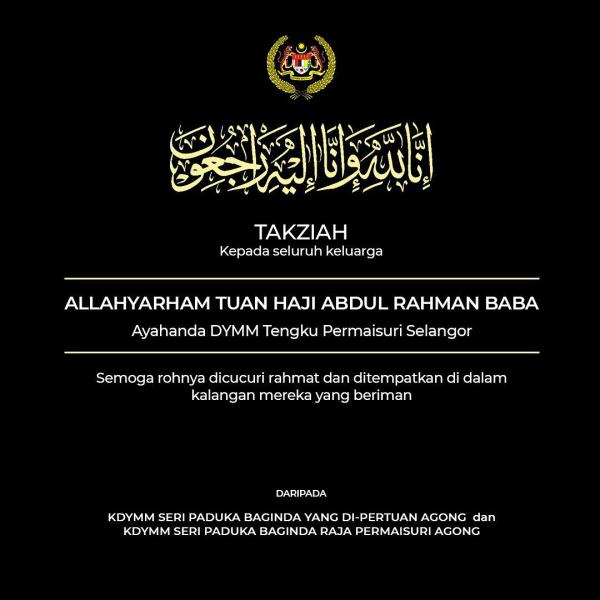 KUALA LUMPUR, April 20 — Yang di-Pertuan Agong Al-Sultan Abdullah Ri'ayatuddin Al-Mustafa Billah Shah and Raja Permaisuri Agong Tunku Hajah Azizah Aminah Maimunah Iskandariah today expressed their condolences to the Sultan of Selangor Sultan Sharafuddin Idris Shah and Tengku Permaisuri of Selangor Tengku Permaisuri Norashikin following the passing of Tengku Permaisuri Norashikin’s father, Abdul Rahman Baba.