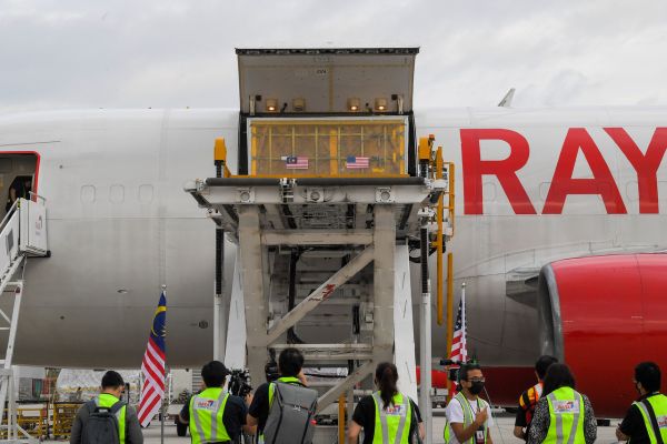 Present at the airport to await the arrival of the aircraft were Coordinating Minister for the National Covid-19 Immunisation Programme (PICK) Khairy Jamaluddin, who is Science, Technology and Innovation Minister; Foreign Minister Datuk Seri Hishammuddin Tun Hussein and US Ambassador to Malaysia Brian McFeeters.