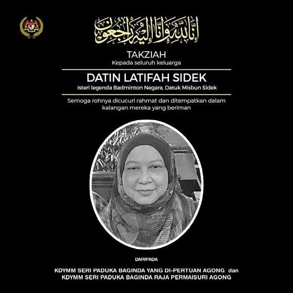 KUALA LUMPUR, July 24 — Yang di-Pertuan Agong Al-Sultan Abdullah Ri'ayatuddin Al-Mustafa Billah Shah and Raja Permaisuri Agong Tunku Hajah Azizah Aminah Maimunah Iskandariah today expressed their condolences to the family of Datin Latifah Sidek, wife of national badminton legend Datuk Misbun Sidek, who died yesterday.