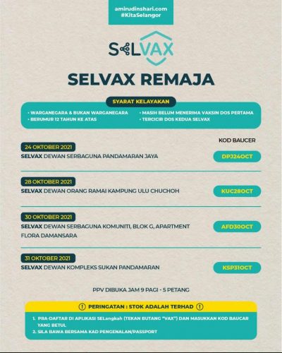 SHAH ALAM, Oct 28 —The Teen Vaksin Selangor (Selvax) programme for those aged 12 and above will be held at Dewan Serbaguna Komuniti Blok G in Apartment Flora Damansara, on this Saturday (October 30)