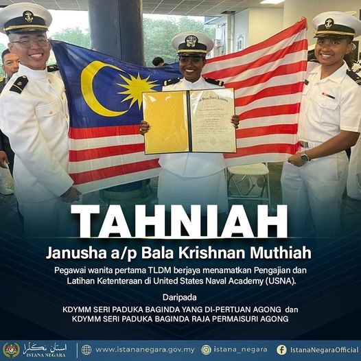 KUALA LUMPUR, June 12 — The Yang di-Pertuan Agong Al-Sultan Abdullah Ri'ayatuddin Al-Mustafa Billah Shah congratulated Royal Malaysian Navy (RMN) senior cadet officer B. Janusha for being the country's first female officer to graduate from the United States Naval Academy (USNA).