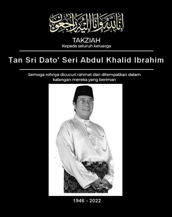 Abdul Khalid, who was born in Jeram, Kuala Selangor, leaves behind his wife, Puan Sri Salbiah Tunut, four children and two grandchildren.