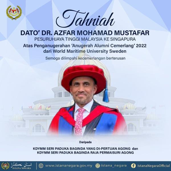 In congratulating Azfar, Al-Sultan Abdullah and the Raja Permaisuri Agong Tunku Hajah Azizah Aminah Maimunah Iskandariah also expressed their joy and pride on the recognition awarded to the High Commissioner of Malaysia to Singapore.