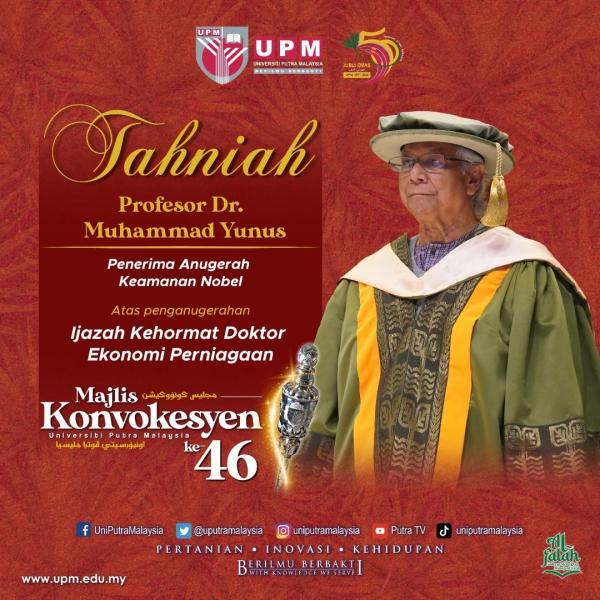 In a statement today, UPM said the Sultan of Selangor Sultan Sharafuddin Idris Shah Alhaj as UPM Chancellor, presented the honorary doctorate to Muhammad Yunus during the first session of the university’s 46th convocation ceremony on Saturday.