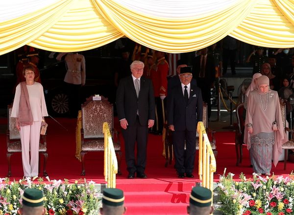 President Steinmeier and his wife Elke Büdenbender were received upon arrival by the Yang di-Pertuan Agong Al-Sultan Abdullah Ri'ayatuddin Al-Mustafa Billah Shah and the Raja Permaisuri Agong Tunku Hajah Azizah Aminah Maimunah Iskandariah.