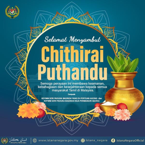 KUALA LUMPUR, April 14 — The Yang di-Pertuan Agong Al-Sultan Abdullah Ri'ayatuddin Al-Mustafa Billah Shah and the Raja Permaisuri Agong Tunku Azizah Aminah Maimunah Iskandariah have conveyed greetings to Tamils and Sikhs celebrating Chithirai Puthandu and the Vaisakhi.
