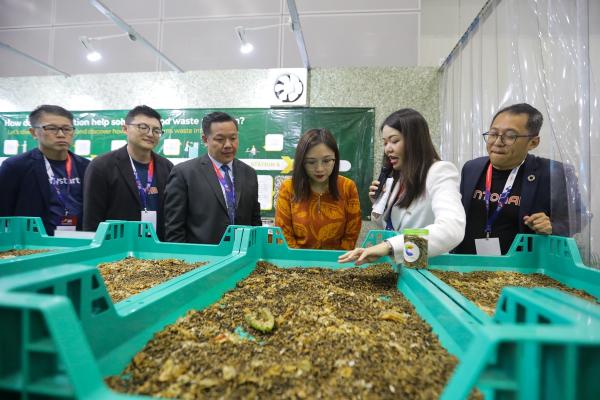 State executive councillor for public health and the environment Jamaliah Jamaluddin (left) listens to Entomal Biotech Sdn Bhd on the usage of black soldier fly larvae in the solid waste management process, during the Selangor International Business Summit (SIBS) 2023 at the Kuala Lumpur Convention Centre, on October 21, 2023. — Picture by HAFIZ OTHMAN/SELANGORKINI[/caption]