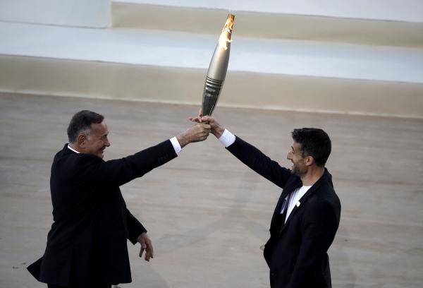 Several thousand fans and tourists sat in the stands of the horse-shaped marble stadium on a sun-drenched afternoon as the head of the Paris Games, Tony Estanguet, received the torch from Greek Olympic Committee president Spyros Capralos.