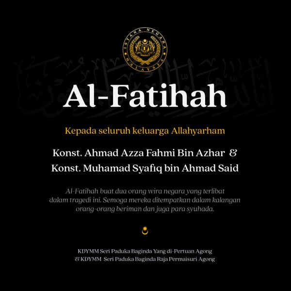 "Al-Fatihah for the two national heroes who perished in this tragedy. May they be placed among the believers and the martyrs," said His Majesty in a Facebook post today.