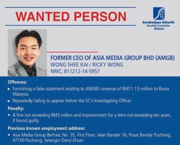 The SC is also seeking public assistance to locate Wong, who is currently wanted for offences under AMLATFPUAA 2001.