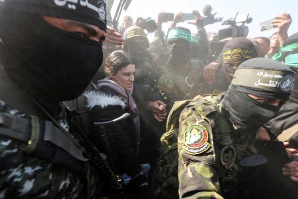 Earlier, in Jabalia in northern Gaza, an Israeli soldier, Agam Berger, wearing an olive green uniform, was led through a narrow alley between heavily damaged buildings and over piles of rubble before being handed to the Red Cross.