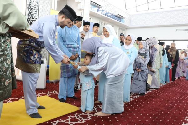 Orphan recipients hold up envelopes of Hari Raya Aidilfitri monies contributed by the Darul Ehsan Islamic Foundation, during the ceremony at Masjid Taman Alam Jaya in Puncak Alam, Kuala Selangor, on March 16, 2025. — Picture by REMY ARIFIN/MEDIA SELANGOR[/caption]