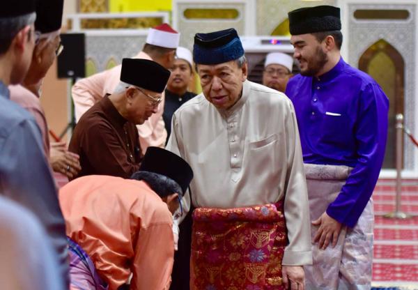 Sultan of Selangor Sultan Sharafuddin Idris Shah Alhaj accepts a business zakat contribution from UPM Holdings Sdn Bhd during a fast-breaking ceremony at the UPM Mosque Square, Serdang, on March 19, 2025. — Picture by MOHD KHAIRUL HELMY MOHD DIN/MEDIA SELANGOR[/caption]