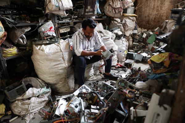 In the western state of Gujarat, 60-year-old scrap dealer Mustakeem Malik uses a hammer to dismantle televisions, air conditioners and routers.