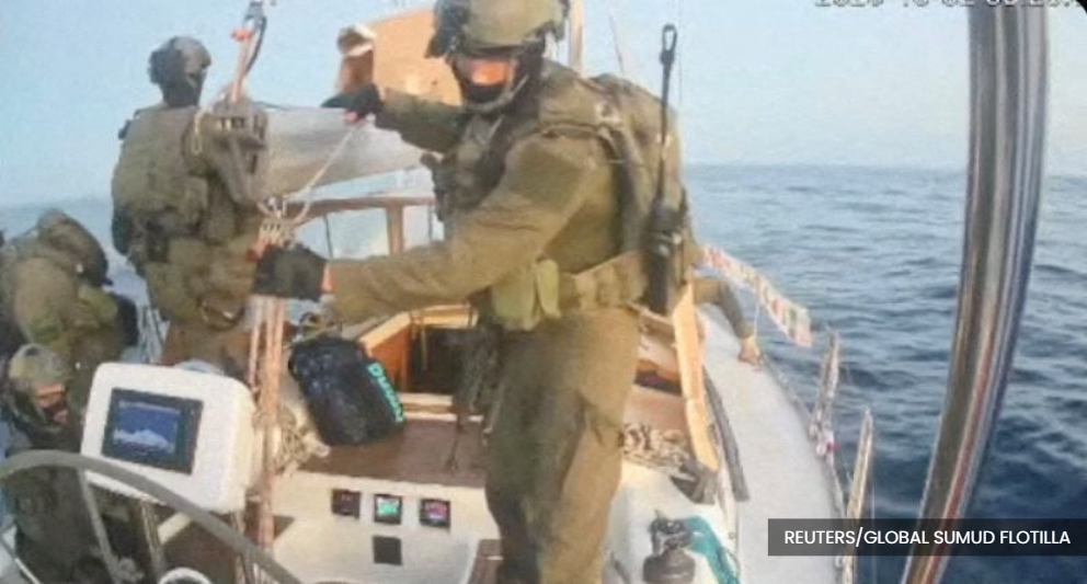 Cameras broadcasting live feeds from the boats, verified by Reuters, showed armed Israeli soldiers sporting helmets and night vision goggles boarding the ships, while passengers huddled together in life vests with their hands up.