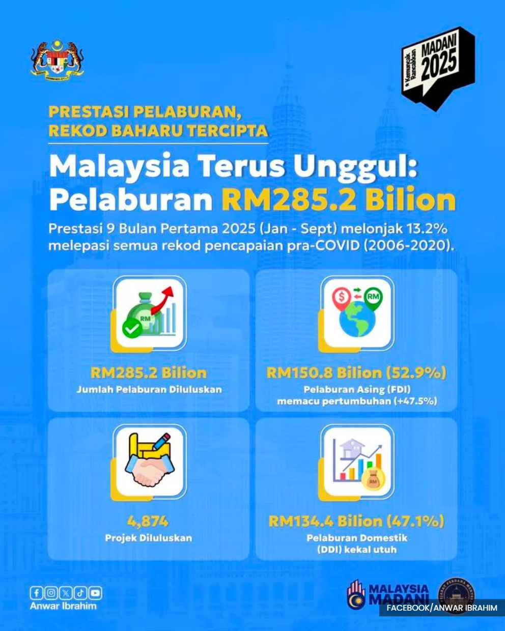 Among others, it stated that Malaysia continued to excel by recording approved investments of RM285.2 billion for the period January to September 2025, a jump of 13.2 per cent, surpassing all pre-Covid achievement records (2006-2020).