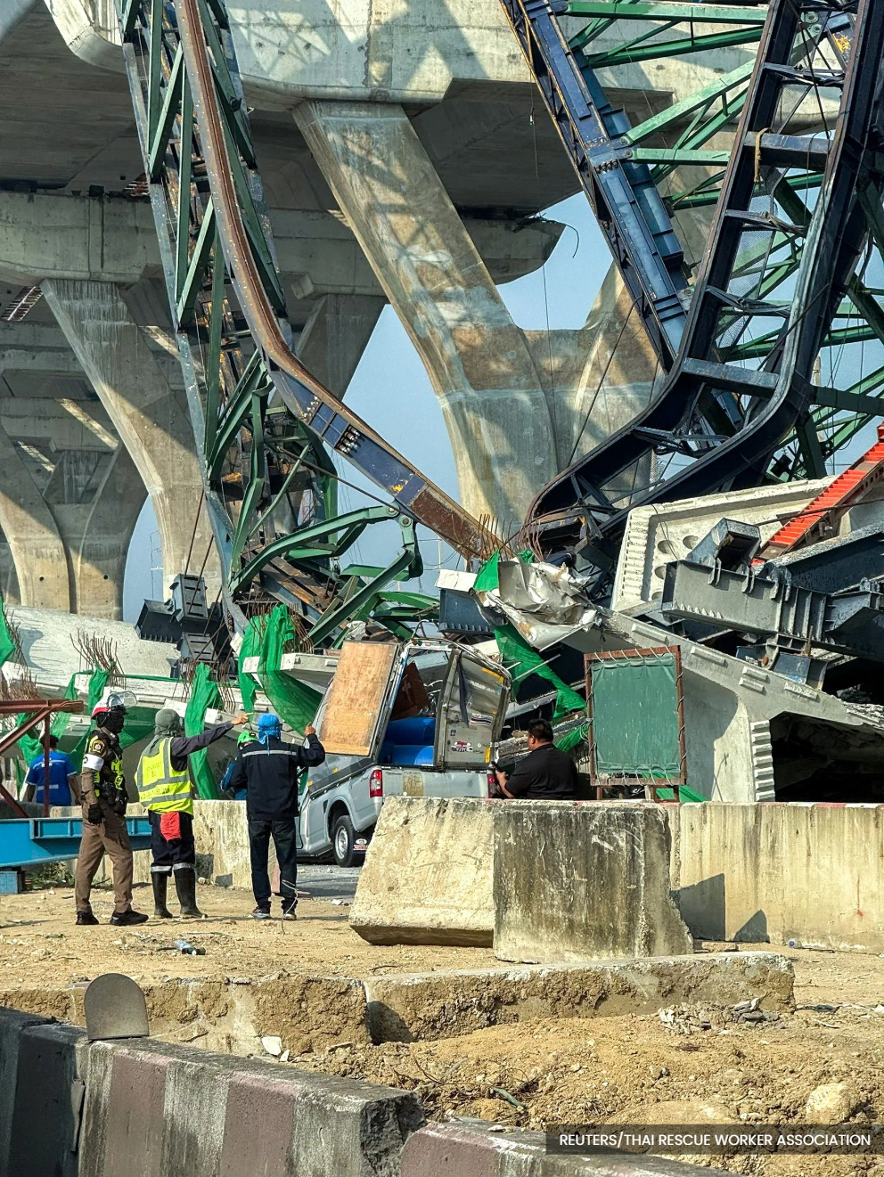 Images from the scene showed a mangled green crane and huge pieces of concrete that had crushed the vehicles below. Video from news outlet Thai Rath showed cars reversing to avoid the wreckage amid a cloud of dust from the collapsed concrete.