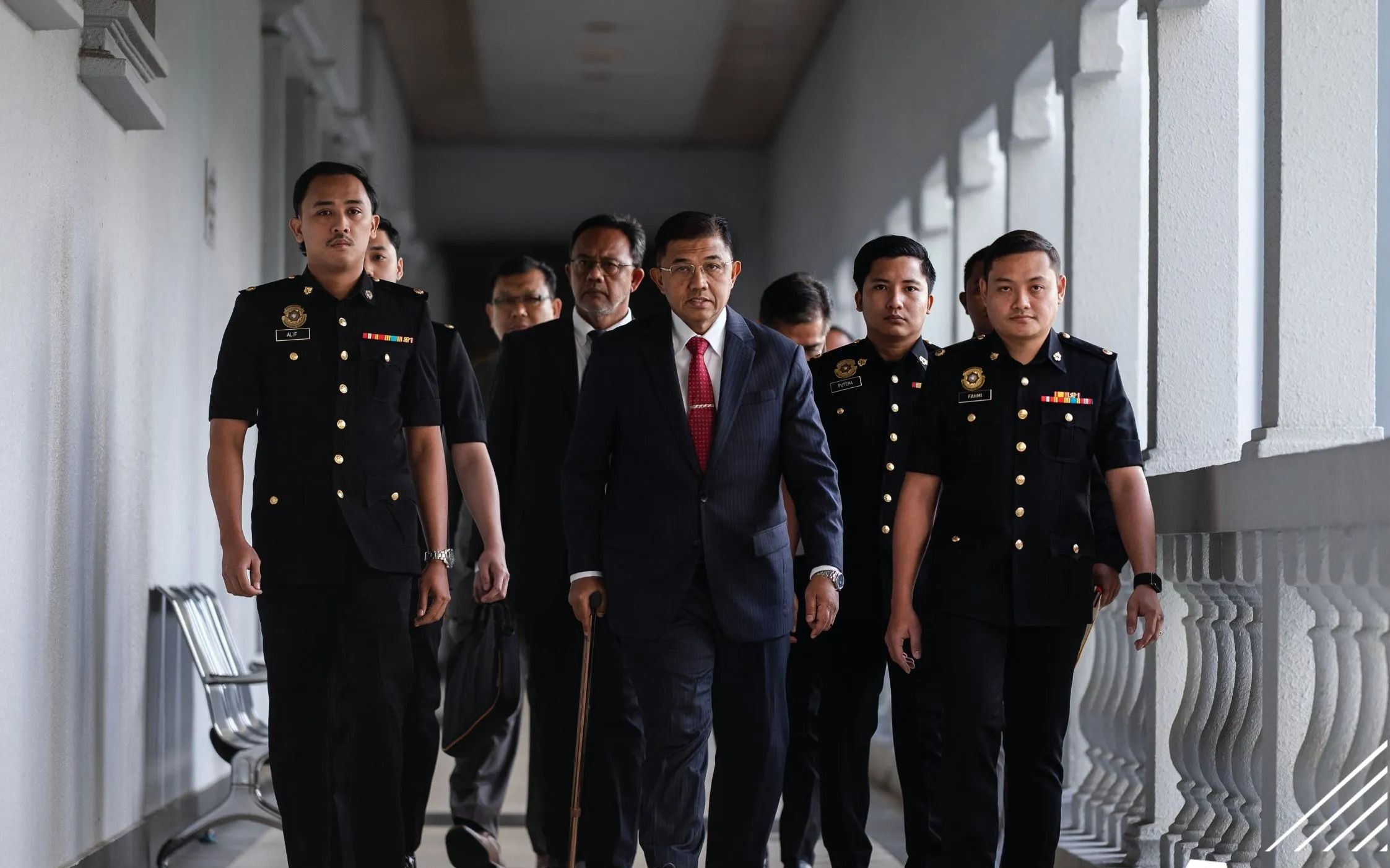 Earlier, he arrived at the Kuala Lumpur Court Complex at 8.20am, supported by a walking stick and accompanied by several Malaysian Anti-Corruption Commission (MACC) officers.