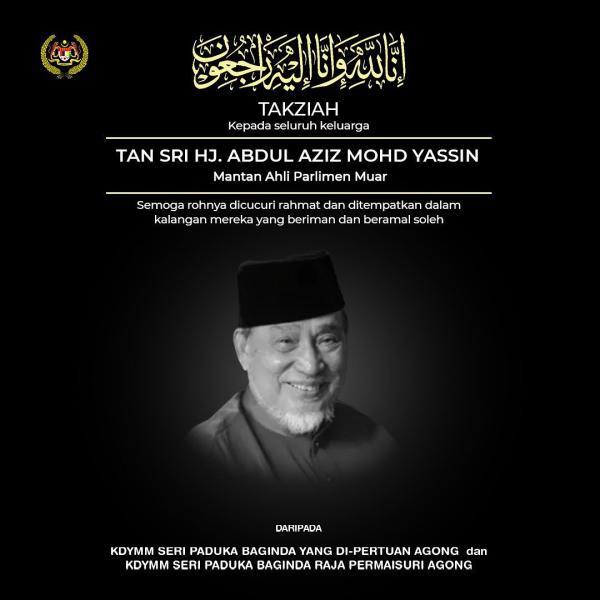 KUALA LUMPUR, Dec 6 — Yang di-Pertuan Agong Al-Sultan Abdullah Ri'ayatuddin Al-Mustafa Billah Shah and Raja Permaisuri Agong Tunku Hajah Azizah Aminah Maimunah Iskandariah conveyed their condolences to the family of former Muar MP Tan Sri Abdul Aziz Mohd Yassin, who died today.