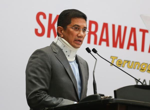 Mohamed Azmin yang disahkan mengalami kecederaan tulang belakang ‘annular tear of spinal disc’ beberapa hari lalu dilihat mula menjalankan tugas rasminya pagi ini dengan penuh semangat walaupun masih memakai 'soft braces'.
