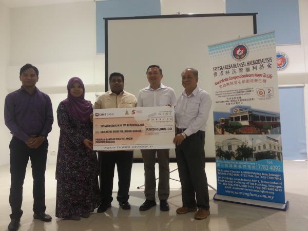 PUCHONG, 9 APR: Sejumlah RM260,000 disumbangkan Kerajaan Negeri bagi membiayai rawatan pesakit buah pinggang, di Yayasan Kebajikan SSL Hemodialisis, di sini.