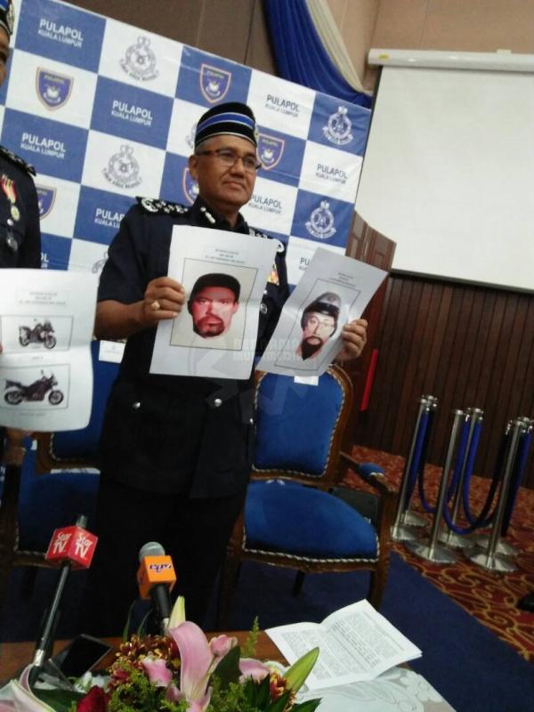 "Mereka berkulit putih, mempunyai janggut, berbadan tegap, setinggi kira-kira 180cm, mereka menunggang motosikal jenis BMW GS atau Kawasaki Versys berwarna hitam semasa hari kejadian," katanya pada sidang akhbar di Pusat Latihan Polis (PULAPOL), Kuala Lumpur, hari ini.