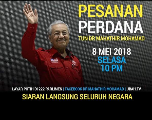 SHAH ALAM, 8 MEI : Pesanan Perdana oleh Pengerusi Pakatan Harapan (PAKATAN), Tun Dr Mahathir Mohamad akan diadakan secara langsung pada jam 10 malam ini.