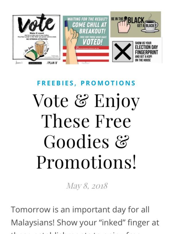 Melalui laman web 'Contest and Events Malaysia' memberitahu, mana-mana pengundi yang sudah selesai membuang undi layak menebus pelbagai ganjaran disediakan syarikat terlibat.