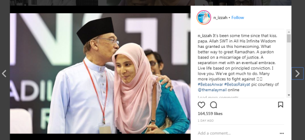 Nurul Izzah melalui instagramnya berkata, sudah sekian lama dia tidak merasai ciuman seorang ayah namun ALLAH SWT membuktikan segalanya berubah pada bulan Ramadan yang mulia.