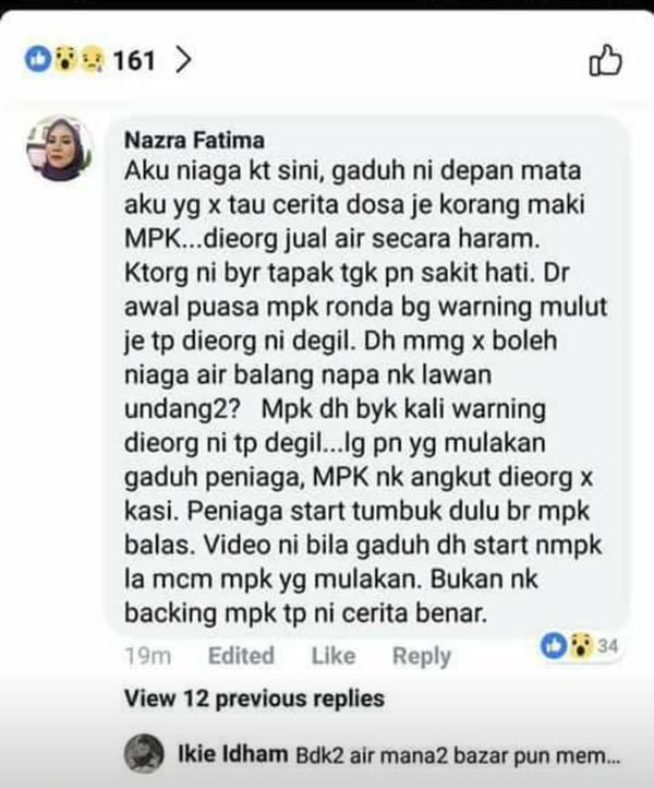 KLANG, 10 JUN: Peniaga Bazar Aidilfitri Jalan Taiping, Nazra Fatima mempertahankan tindakan Anggota Penguatkuasa Majlis Perbandaran Klang (MPK) dalam video pergaduhan bersama peniaga air yang tular di media sosial sejak semalam.