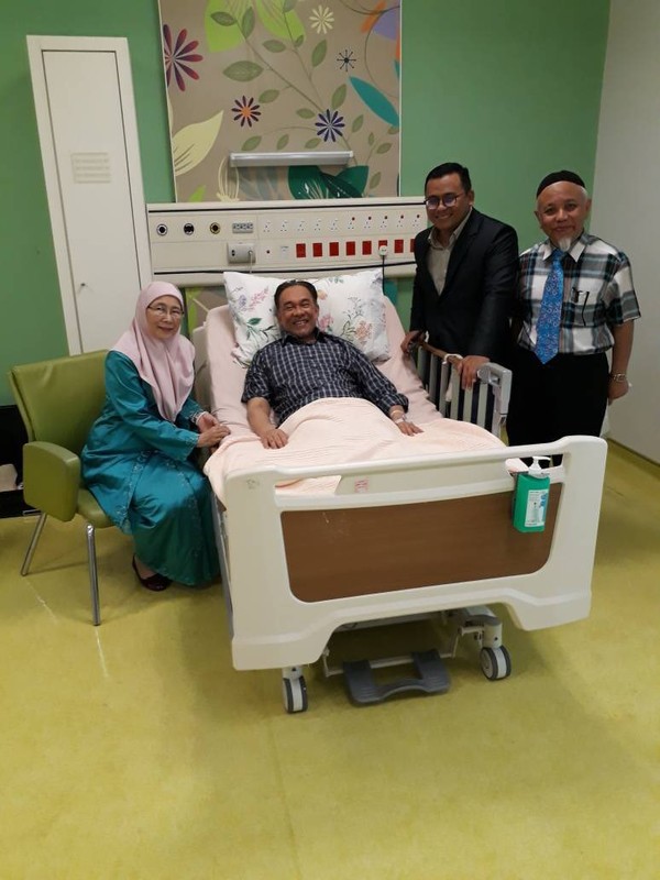 "Menziarahi Dato' Seri Anwar Ibrahim di PPUM. Beliau sedang berehat dan ditemani Datuk Seri Dr Wan Azizah.