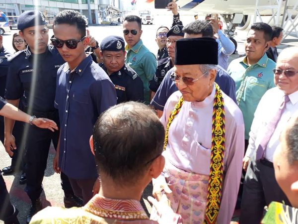 Ketibaan Dr Mahathir yang juga Pengerusi Pakatan Harapan dan isteri disambut oleh Timbalan Ketua Menteri Datuk Amar Douglas Uggah Embas dan Pengerusi DAP Sarawak merangkap Pengerusi Pakatan Harapan negeri Chong Chieng Jen.