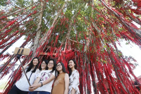 Pengunjung dari Pulau Pinang tidak melepaskan peluang bergambar bersama di hadapan 'Sekinchan Wishing Tree' ketika berkunjung di kawasan tersebut, Sekinchan. 12 OGOS 2018 | ASRI SAPFIE