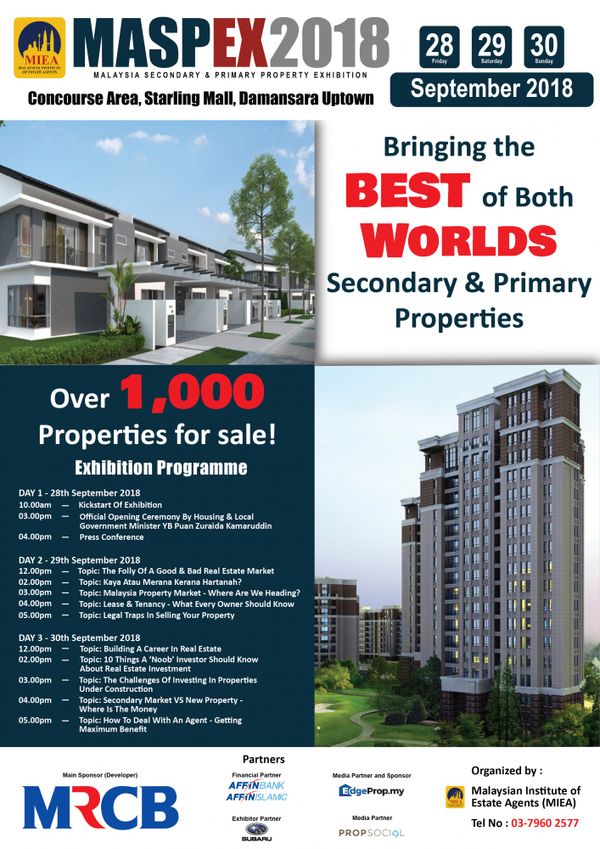 KUALA LUMPUR, 23 SEPT: Pameran Hartanah Sekunder dan Primer Malaysia (Maspex 2018) akan menawarkan lebih 1,000 hartanah daripada 25 pempamer dalam semua jenis hartanah dan kategori harga kepada pembeli yang berminat.