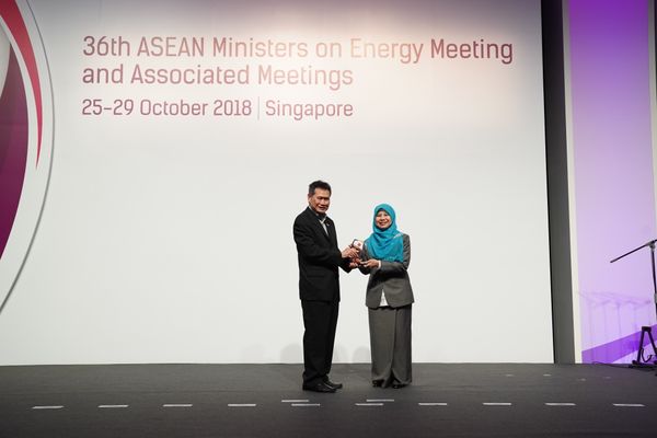 Ketua Pegawai Eksekutif PKNS, Datin Paduka Dr Noraida Mohd Yusof menerima anugerah berkenaan daripada Setiausaha Agung ASEAN, Dato Lim Jock Hoi sempena 36th ASEAN Minister on Energy Meeting (AMEM).