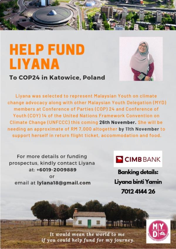 SHAH ALAM, 11 NOV: Seorang pejuang aktivis perubahan iklim memerlukan bantuan dana RM3,000 untuk mewakili Malaysia ke Conference of Youth (COY) 14 dan Conference of Parties (COP) 24 United Nations Framework Convention On Climate Change (UNFCCC), di Katowice, Poland.