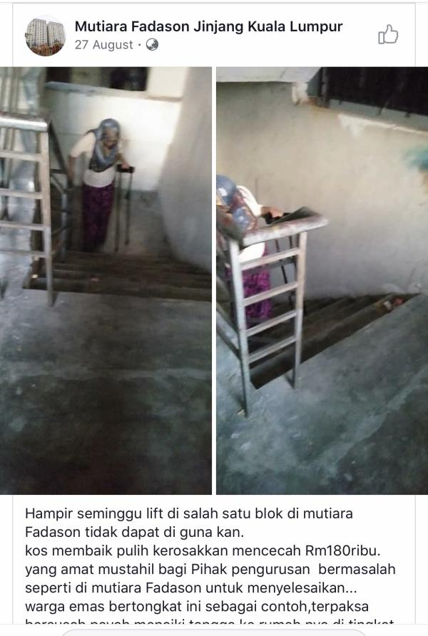 Beliau berkata, keadaan yang berlaku di Flat Mutiara Fadason itu turut menyebabkan ada di antara warga emas, ibu mengandung dan kanak-kanak terpaksa menggunakan tangga setiap hari.