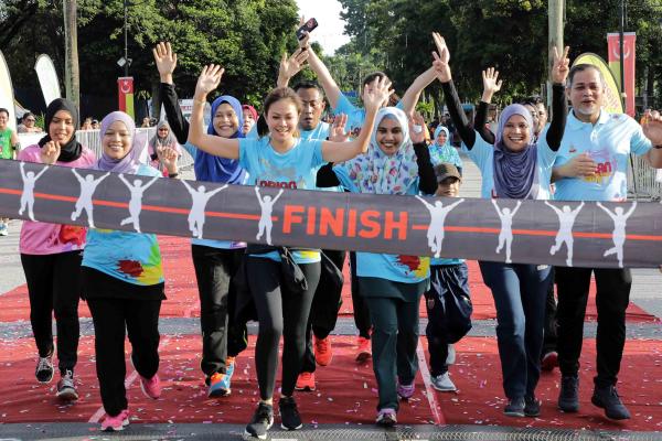 Para peserta turut mengambil kesempatan merakam gambar kenangan bersama Tengku Permaisuri Norashikin yang selesai menamatkan larian pada jam 8.30 pagi dan Masdiana kemudiannya mengalungkan pingat kepada Baginda.