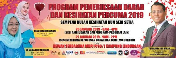SHAH ALAM, 24 JAN: Pusat Khidmat Dewan Undangan Negeri (DUN) Seri Setia bakal menganjurkan Program Pemeriksaan Darah dan Kesihatan Percuma kepada 100 peserta terawal pada 26 dan 27 Januari ini, di Dewan Serbaguna MBPJ Kg Lindungan PJS 6/1, di sini.