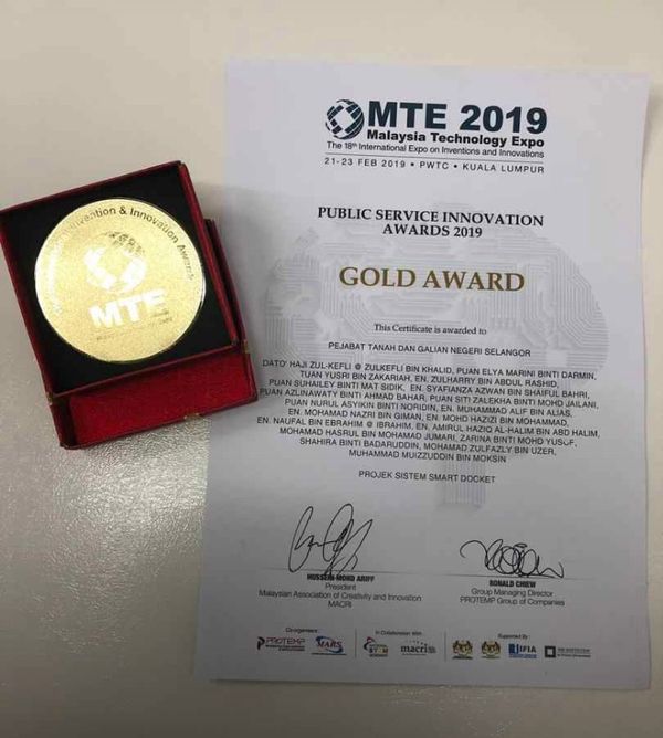 SHAH ALAM, 23 FEB: Inovasi Smart Docket yang dipertandingkan di Malaysia Technology Expo (MTE) 2019, di Pusat Dagangan Dunia Putra Kuala Lumpur, melalui kategori Public Service Innovation Awards berjaya menggondol Anugerah Emas (Gold Award).