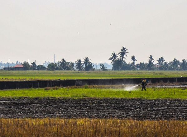 Pesawah melakukan kerja penyiraman baja di dalam petak sawah beliau di Sekinchan | HAFIZ OTHMAN