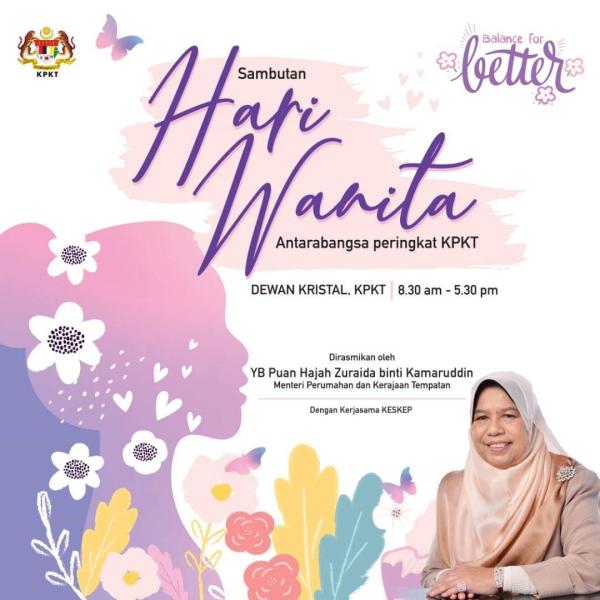 SHAH ALAM, 8 MAC: Kementerian Perumahan dan Kerajaan Tempatan (KKPKT) tekad memastikan golongan wanita mendapat tempat dalam segala hal berkaitan pembangunan, terutamanya dari sudut peningkatan taraf hidup dalam komuniti dan keterlibatan secara langsung dalam perencanaan kehidupan bermasyarakat.