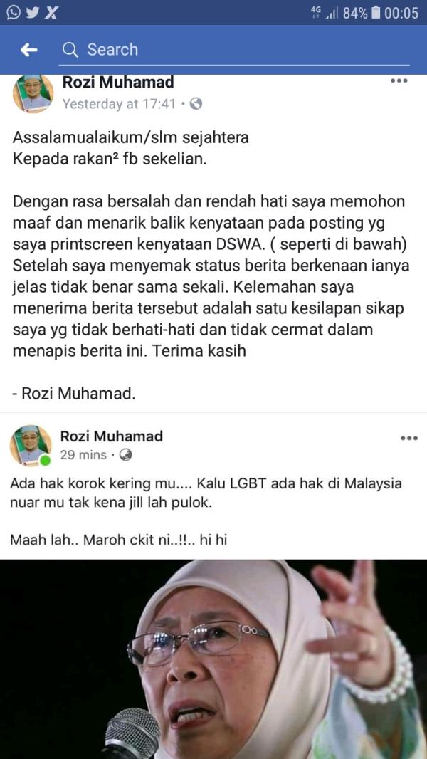 SHAH ALAM, 12 MAC: Ahli Dewan Negeri Tendong, Kelantan, Rozi Muhamad membuat permohonan maaf secara terbuka kepada nitizen di media sosial facebook ekoran kata-kata kesat yang dihamburkan kepada Timbalan Perdana Menteri, Datuk Seri Dr Wan Azizah Wan Ismail menjadi tular selepas dikongsi penyokongnya.