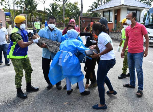 Kapsyen foto: Petugas dan anggota Rela membantu seorang wanita yang pengsan ketika hendak mendapatkan rawatan awal di Dewan Serbaguna Taman Pasir Putih hari ini. Dewan itu mula dibuka sejak Ahad lepas bagi memberi rawatan awal kepada orang ramai yang mengalami sesak nafas, loya atau muntah sebelum mereka yang memerlukan rawatan lanjut dibawa ke Hospital Sultan Ismail (HSI). --fotoBERNAMA (2019) HAK CIPTA TERPELIHARA