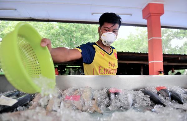 Kapsyen foto: JOHOR BAHRU, 16 Mac -- Amin Aszizi, 20, memakai penutup hidung dan mulut ketika berniaga di Pasar Nelayan Persatuan Nelayan Johor Selatan sebagai langkah pencegahan ekoran pencemaran sisa kimia di Sungai Kim Kim ketika tinjauan di Kampung Pasir Gudang Baru, hari ini. Jualan hasil tangkapan laut di pasar tersebut merosot kerana pelanggan bimbang dengan bahan kimia yang mencemari sungai itu. --fotoBERNAMA (2019) HAK CIPTA TERPELIHARA
