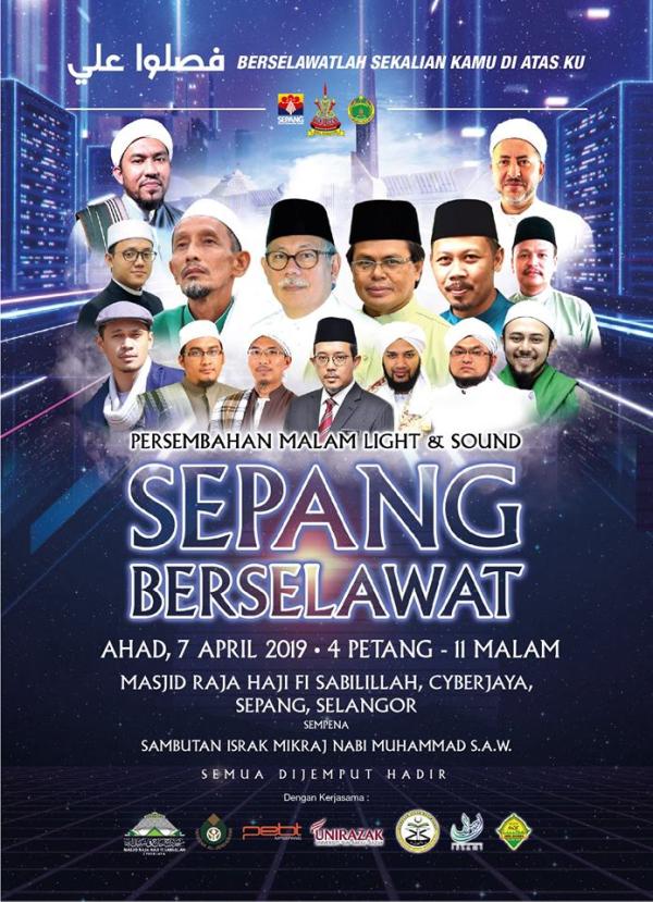 SHAH ALAM, 7 APRIL: Majlis Perbandaran Sepang menjemput orang ramai di sekitar Selangor hadir ke Persembahan Malam Light and Sound Sepang Berselawat 2019, malam ini, di Dewan Masjid Raja Haji Fi Sabilillah, Cyberjaya.