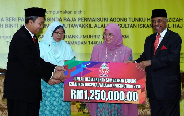 KUALA LUMPUR, 15 MEI: Raja Permaisuri Agong Tunku Azizah Aminah Maimunah Iskandariah berkenan menyampaikan sumbangan Majlis Agama Islam Wilayah Persekutuan (MAIWP) berjumlah RM1.35 juta kepada 14 tabung kebajikan hospital hari ini.